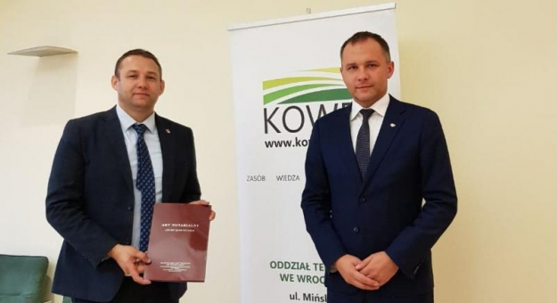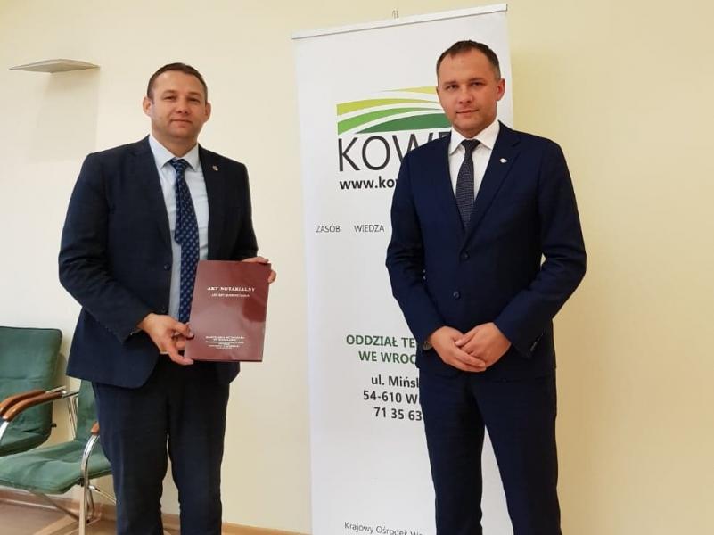 - Wójt Wojciech Płaziuk oraz dyrektor KOWR we Wrocławiu Tomasz Krzeszowiec, podpisali akt notarialny, w którym doprecyzowano oświadczenie na podstawie art. 44 ust. 1 ustawy o gospodarowaniu nieruchomościami rolnymi Skarbu Państwa. Był to warunek pozyskania pomocy finansowej dla gminy Udanin, dzięki której zostanie przebudowana droga - informują pracownicy Urzędu Gminy Udanin.