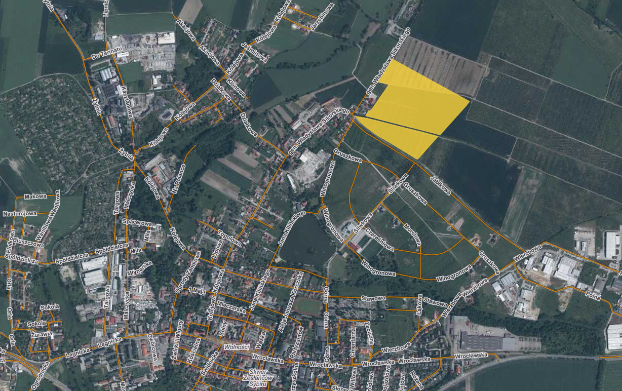 Tereny wykupione przez Polskie Domy Drewniane S.A. - opracowanie Echo Średzkie na podstawie Geoportal 2