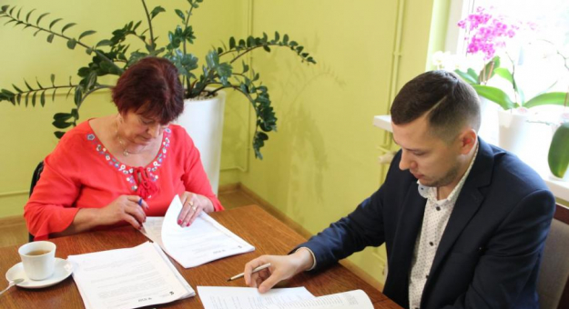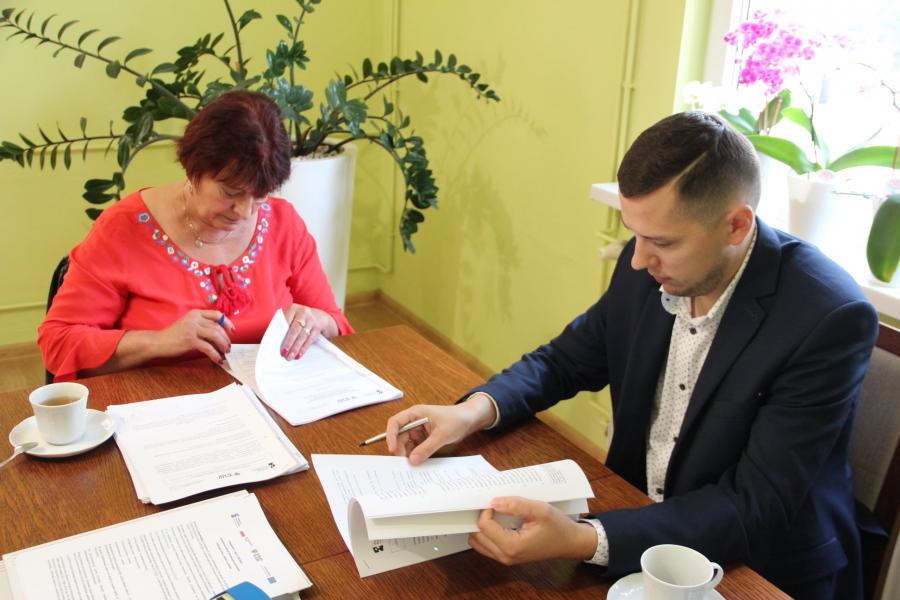 W Urzędzie Gminy Kostomłoty Prezes Stowarzyszenia Lokalna Grupa Działania Szlakiem Granitu Krystian Ulbin oraz Janina Gawlik wójt Gminy Kostomłoty podpisali umowę partnerską na realizację projektu pt.: "Gmina Kostomłoty wspiera Seniorów - utworzenie Dziennego Domu Senior+".