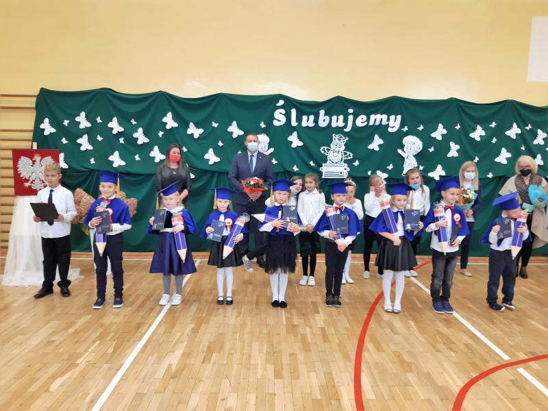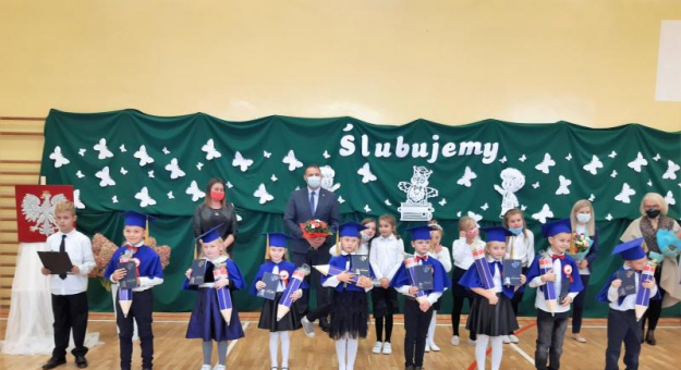 Uroczystość odbyła się w piątek 23 października 2020r. Ślubowanie ze względu na sytuację epidemiologiczną, wyglądało nieco inaczej niż zwykle. Dzieciom nie mogli niestety towarzyszyć uczniowie klas starszych. Nie zmienia to jednak faktu, iż dzień 23 października był dla pierwszoklasistów dniem niezwykłym i bardzo podniosłym.