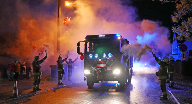 Chwilę po 21 tradycyjnie przy użyciu środków pirotechnicznych i akompaniamencie syreny wóz stawił się przed remizą w Udaninie. Wydarzenie ozdobił pokaz fajerwerków.