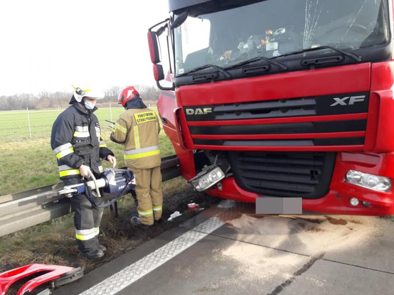 Do zdarzenia doszło 14 grudnia około godz. 11. W wyniku gwałtownego hamowania, przewożony ładunek przebił ścianę gordziową naczepy. Kierowcę z kabiny uwalniali strażacy.