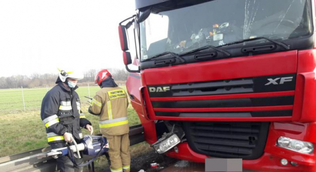 49-letni kierowca został uwięziony w kabinie swojego pojazdu. W wyniku gwałtownego hamowania ładunek, który przewoził, niebezpiecznie przesunął się. Pręty zbrojeniowe o wadze blisko 24 ton uderzyły w kabinę kierowcy powodując jej deformację i zablokowanie drzwi. W opuszczeniu pojazdu musieli pomóc mężczyźnie strażacy. Na szczęście nie doszło do tragedii.
