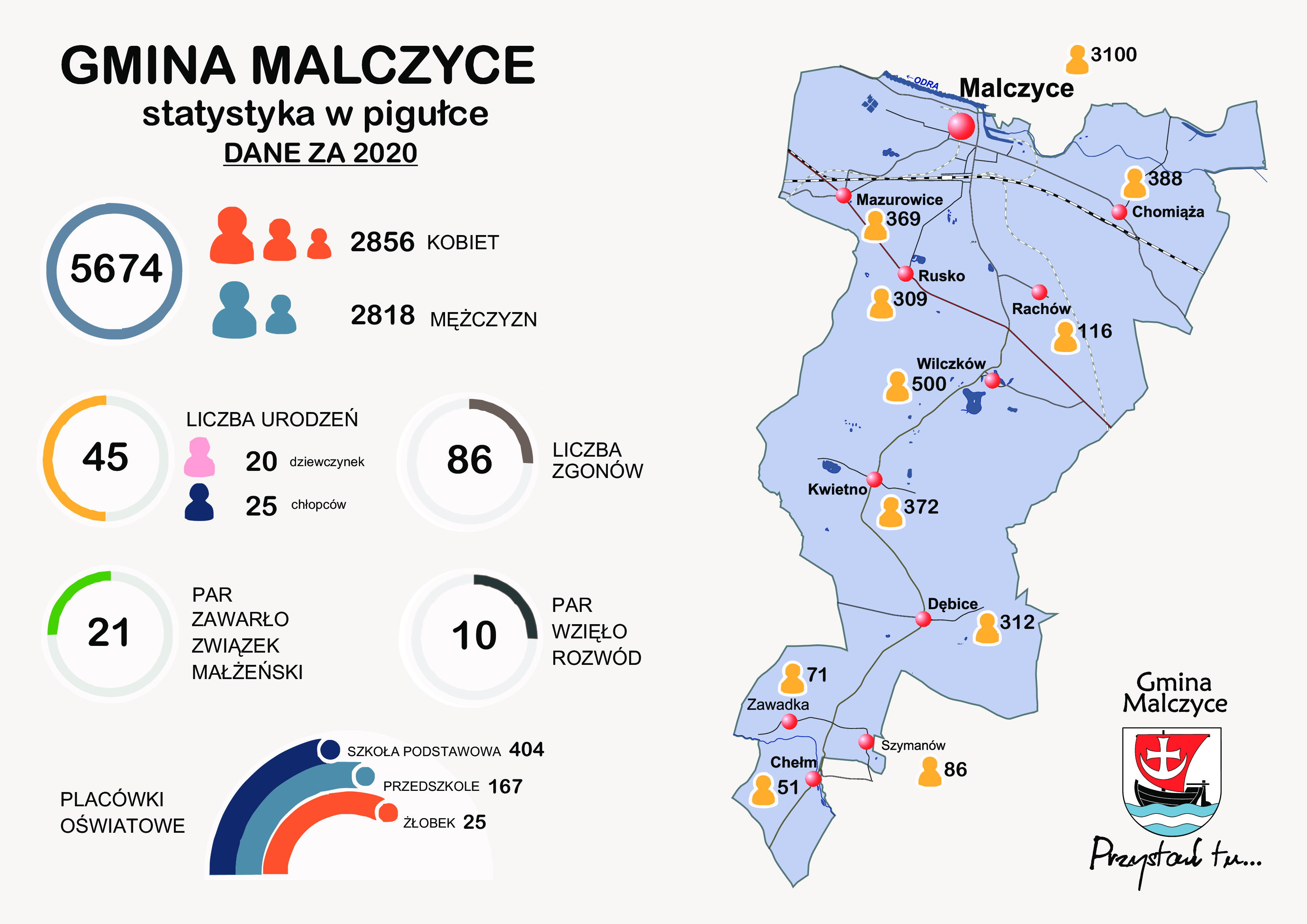 31 grudnia 2020 r. na terenie gminy zameldowanych było 5674 osób, w tym 2856 kobiet i 2818 mężczyzn. W porównaniu do roku ubiegłego, liczba mieszkańców naszej gminy zmniejszyła się o 56 osób, niestety odnotowaliśmy więcej zgonów niż narodzin.