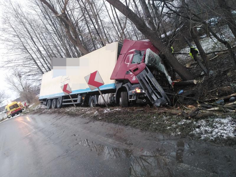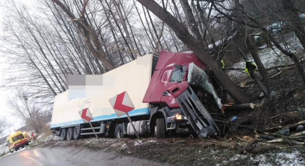 Mężczyzna lat 56 nie dostosował prędkości do warunków panujących na drodze. Zjechał na przeciwległy pas i uderzył w drzewo. Kierowca tira został przetransportowany do szpitala we Wrocławiu. Droga w tym miejscu była przejezdna do momentu usuwania auta z rowu.