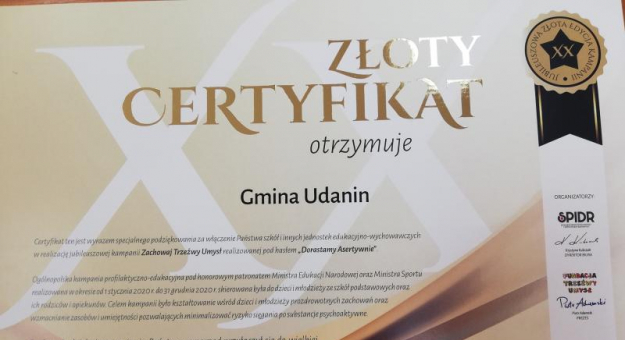 Gmina Udanin oraz wójt Wojciech Płaziuk otrzymali złote certyfikaty, które są specjalnym podziękowaniem za włączenie się w realizację kampanii.