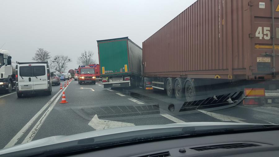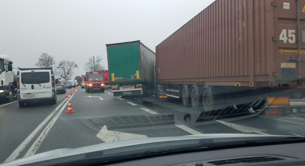 Najprawdopodobniej przyczyną zdarzenia było wymuszenie pierwszeństwa przejazdu. Obie ciężarówki jechały w tym samym kierunku. Kierowca pierwszej podczas skrętu w prawo zjechał na przeciwległy pas ruchu. W wyniku tego jadąca za nim ciężarówka wjechała w pojazd. Jedna osoba została poszkodowana, posiada ogólne potłuczenia ciała. Na miejscu działa straż pożarna, pogotowie i policja. Ruch odbywa się wahadłowo.