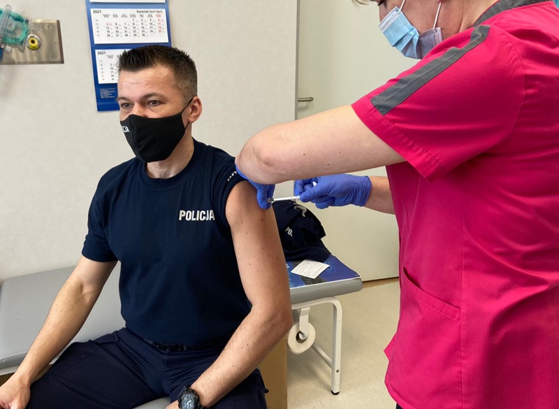 Za przykładem Komendanta oraz jego Zastępcy szczepionkę przyjęli kolejni policjanci. To funkcjonariusze pełniący funkcje w rożnych pionach i na różnych stanowiskach, w szczególności z tzw. pierwszej linii. Niebawem kolejna grupa funkcjonariuszy otrzyma pierwszą dawkę