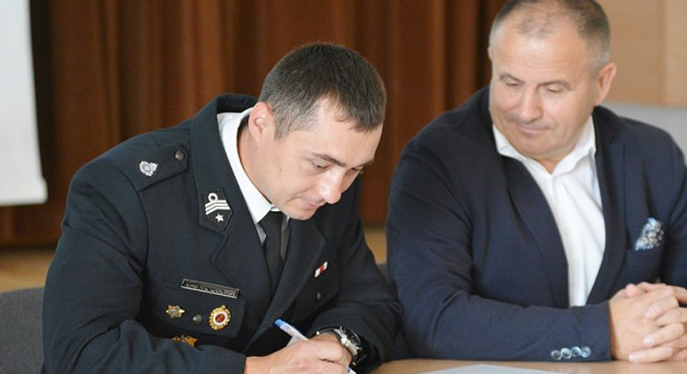 Adam Krzyżanowski wraz wójtem gminy Miękinia podczas przekazania sprzętu strażackiego w 2018 roku fot.: anbo