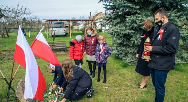 Kwiaty i symboliczny znicz pod "Dębem Pamięci" podpułkownika Antoniego Fleszara złożyli dyrektor Dorota Byra, wójt Wojciech Płaziuk oraz przedstawiciele Samorządu Uczniowskiego: Milena Sobala z klasy VII, Maja Piwowar, Paweł Pilarski i Martyna Kępa uczniowie klasy II.