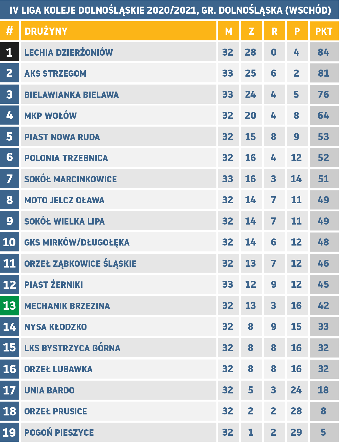 Od pewnego czasu wiadomo było, że przez komplikacje związane z lockdownem nie uda się rozegrać wszystkich ligowych kolejek, a organizator rozgrywek zabezpieczył się na tę okoliczność zmieniając przed sezonem regulamin. Zgodnie z nim zatem 26 czerwca 35. kolejka będzie ostatnią rozegraną w tym sezonie w IV lidze. Do miejsca pozwalającego na pozostanie w stawce piłkarzom z Brzeziny brakuje 3 punktów. Zadanie jest jednak o tyle trudne, że przełamanie musiałoby przyjść z liderem, Lechią Dzierżoniów, na boisku rywala. Nadzieją dla brzezinian jest fakt, że już dwa dni później, w poniedziałek, Lechia zagra mecz barażowy o III ligę. Drugim warunkiem koniecznym do utrzymania jest jednak porażka Piasta Żerniki. Wrocławianie grają w Pieszycach, na boisku ostatniej drużyny ligi i są murowanym faworytem tego meczu. Należy mieć także na uwadze, że w okręgówce zagra w przyszłym drużyna, która zajmie 12. miejsce w którejś z dwóch grup. Aktualnie byłaby nią Odra Ścinawa z grupy zachodniej. Jednak jak mawiał klasyk: "Dopóki piłka w grze, wszystko jest możliwe".