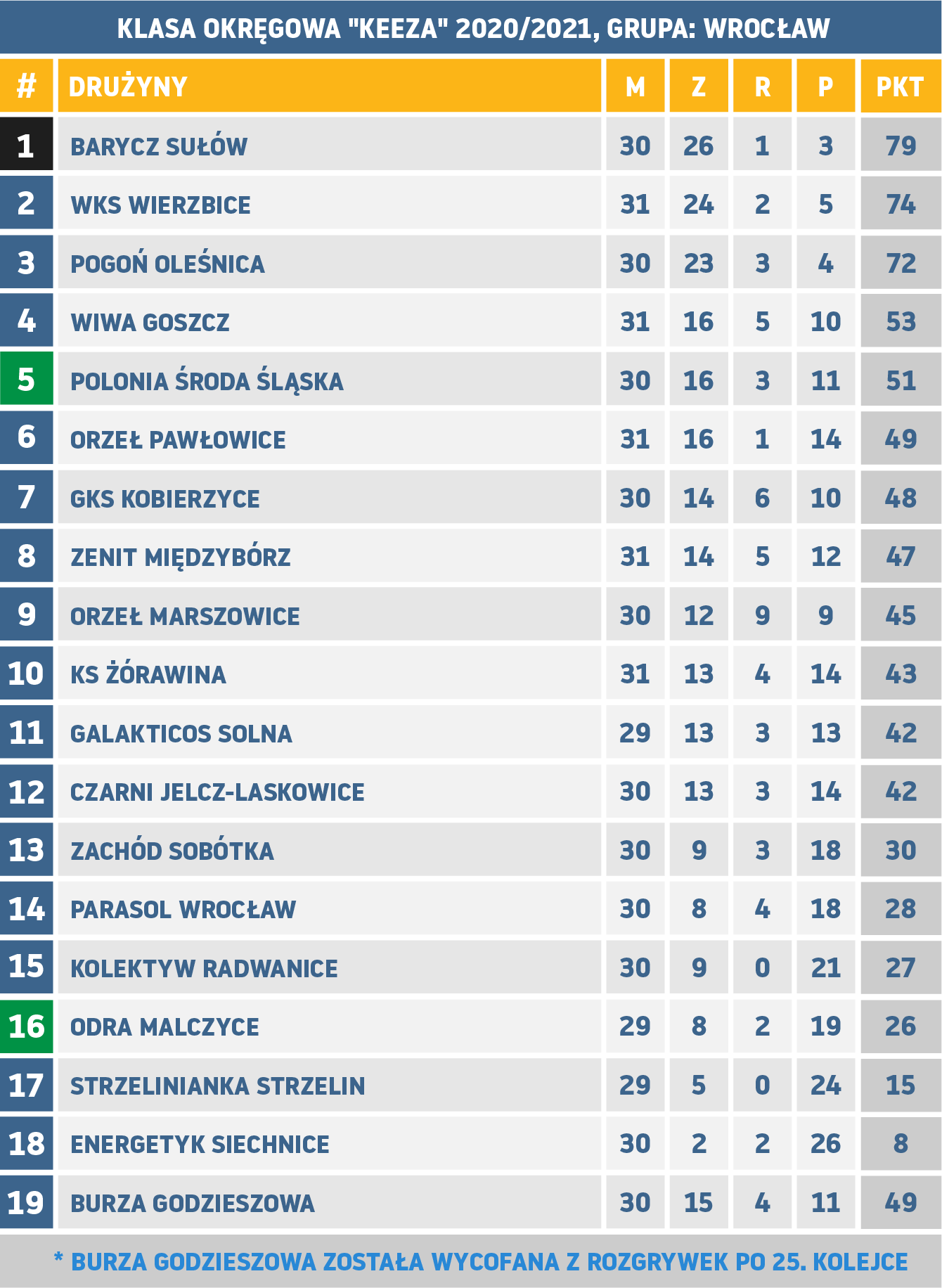 Tym zwycięstwem Polonia Środa Śląska wykorzystuje potknięcie Orła Pawłowice i wskakuje na 5. miejsce w tabeli. Zespół z Miasta Skarbów może zakończyć sezon tuż za podium. Do tego potrzebna jest wygrana w sobotnim meczu ze Strzelinianką Strzelin. Zawodnicy wyjdą na murawę Stadionu Miejskiego o godzinie 17.