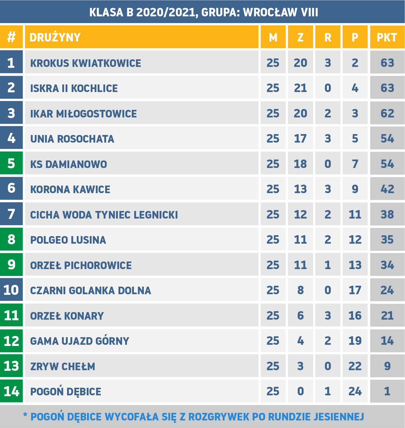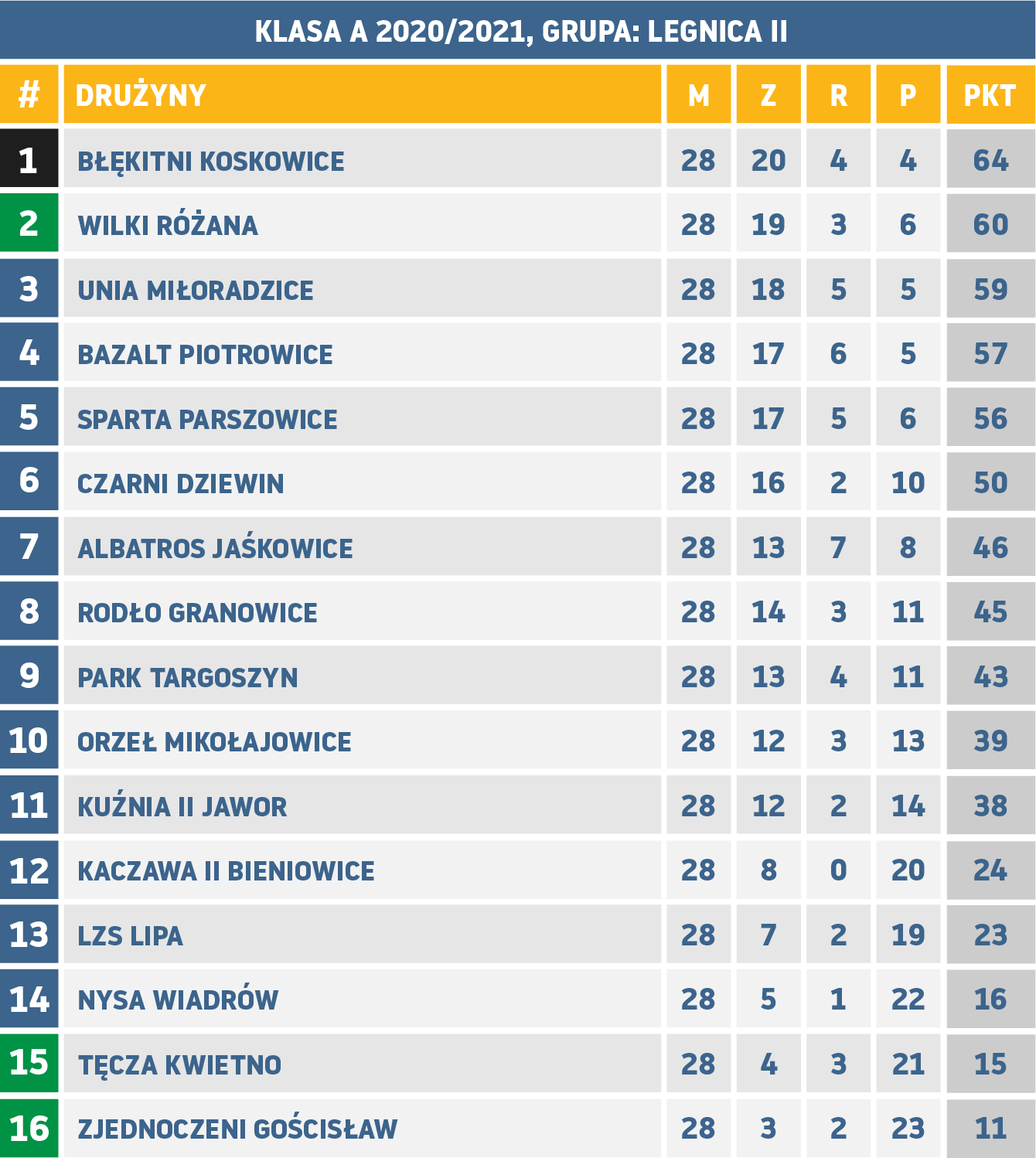 Wciąż w walce o awans do legnickiej okręgówki pozostają Wilki Różana. Obecny wicelider traci do Błękitnych Koskowice cztery punkty, zatem matematyczne szanse pozostają. Rywale podopiecznych trenera Ulanickiego musieliby przegrać oba spotkania.
