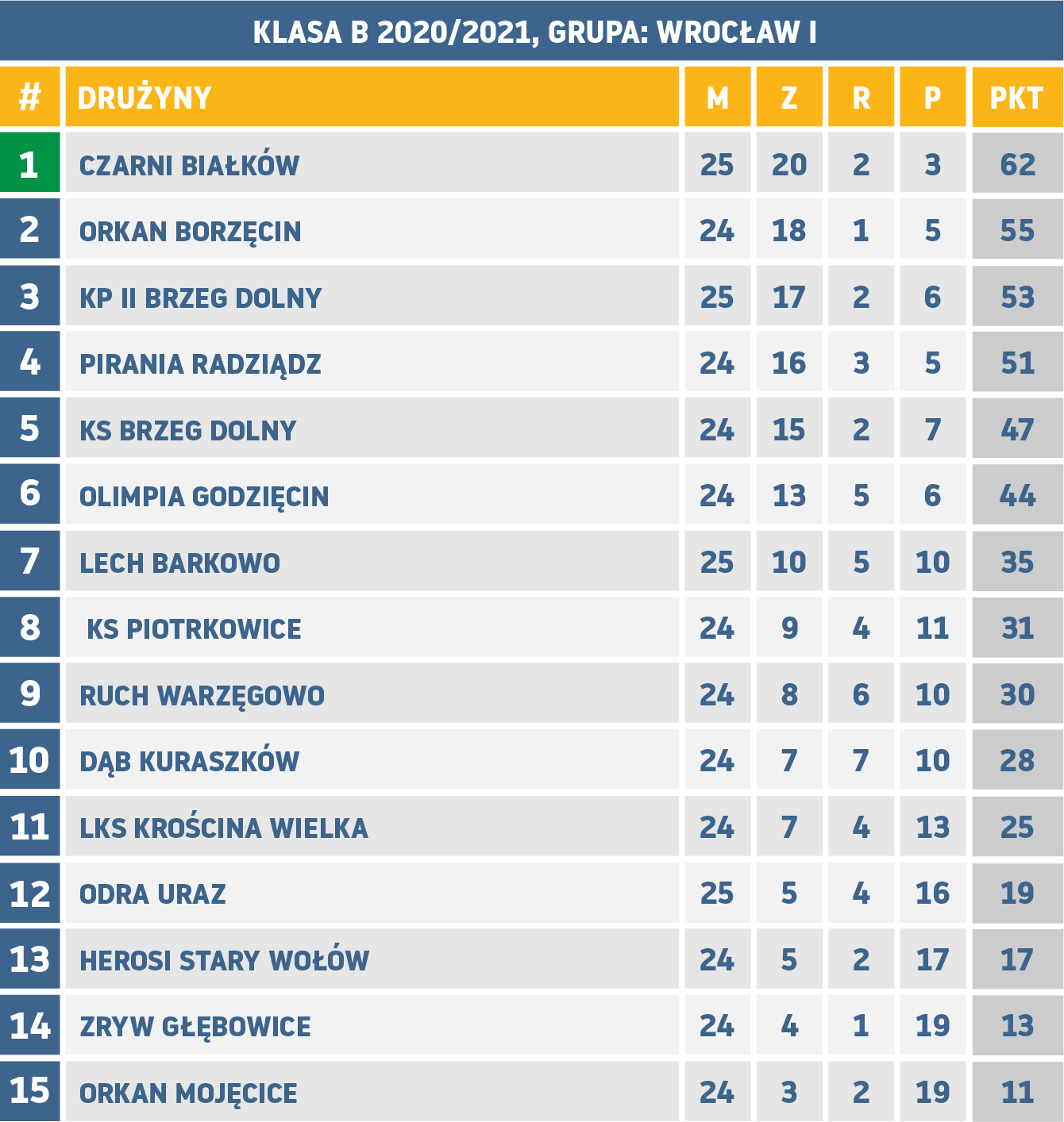 Niedzielne zwycięstwo 5:4 Czarnych Białków nad Dąbem Kuraszków było ostatnim meczem tej drużyny w B klasie. Zespół zapewnił sobię awans do wyższej klasy rozgrywkowej, a w ostatniej kolejce pauzuje z racji nieparzystej ilości zespołów w lidze.