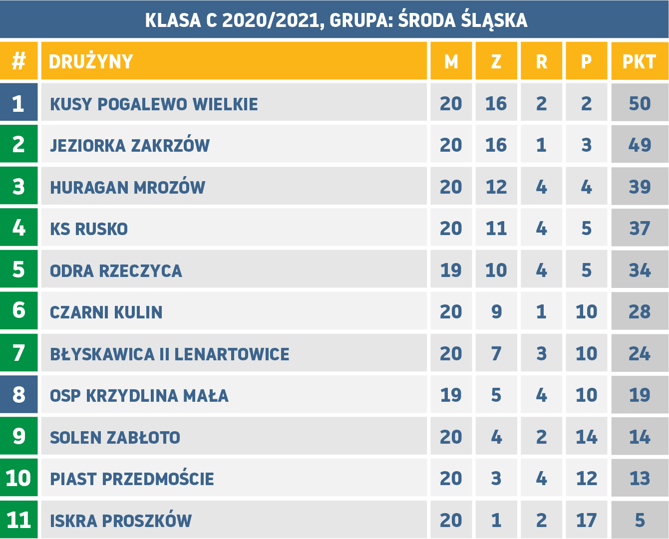 Zakończyły się rozgrywki średzkiej C klasy. Ligę wygrał zespół Kusy Pogolewo Wielkie, wyprzedzając o jeden punkt Jeziorka Zakrzów. - Dziś rozegraliśmy ostatni mecz w klasie C. Jeziorka Zakrzów - KS Odra Rusko 4:0, bramki K. Stasiak (2), M. Blauth (2). Następny sezon rozegramy w klasie B. Dziękuję wszystkim chłopakom za zangażowanie i zdrowie zostawione na boisku - komentuje zespół z Zakrzowa.