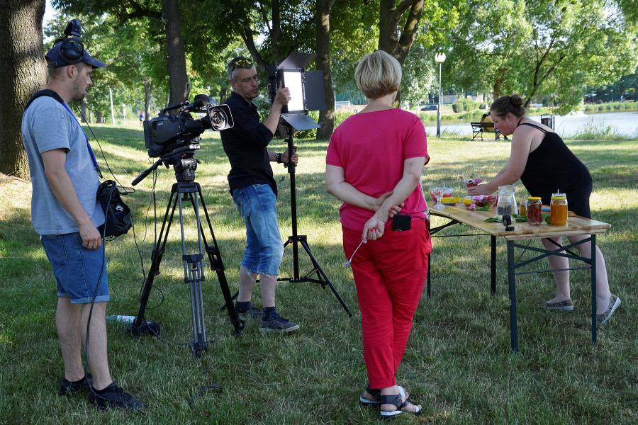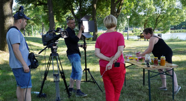 Późnym popołudniem na Kajakach na ekipę programu czekała Agnieszka Kogutek - szefowa Koła Gospodyń Średzkich i prezes Stowarzyszenia Forum Sołtysów Powiatu Średzkiego. Jej zadaniem było zaprezentowanie dowolnego przepisu z użyciem miodu. - Do programu przygotowałam pudding jaglany z truskawkami, różą damasceńską i miodem oraz lemoniadę z kwiatów czarnego bzu z miodem i limonką - opowiada pani Agnieszka i dodaje, że już wkrótce szykują się kolejne nagrania z jej udziałem. - Ekipa była bardzo sympatyczna. Wspomniałam pani Agacie o Wirtualnym Ryneczku, czyli grupie na facebook’u, którą prowadzę. Skupia ona lokalnych rolników, rękodzielników i rzemieślników. Temat tak jej się spodobał, że już niedługo ekipa znów nas odwiedzi - śmieje się pani Kogutek.