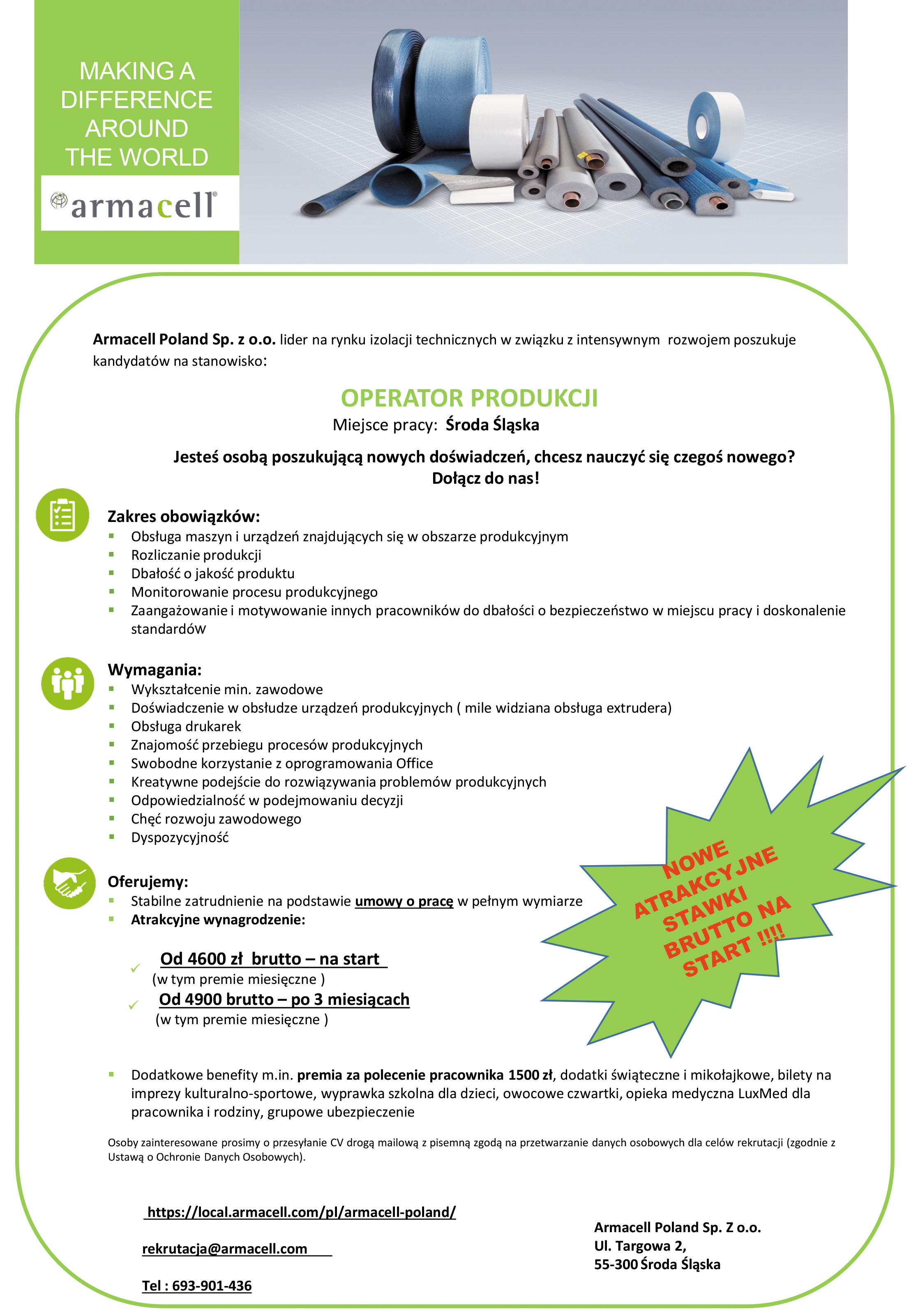 Armacell Poland Sp. z o.o. lider na rynku izolacji technicznych w związku z intensywnym rozwojem poszukuje kandydatów na stanowisko: OPERATOR PRODUKCJI I MAGAZYNIER.