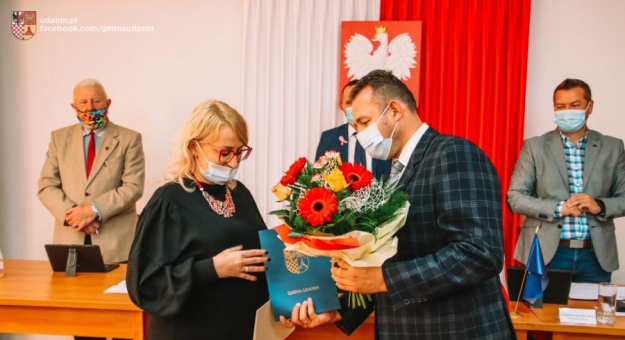 Nauczycielka ze Szkoły Podstawowej im. Adama Mickiewicza w Udaninie Justyna Rosińska-Tłusty złożyła ślubowanie nauczyciela mianowanego. Wójt Wojciech Płaziuk wręczył nauczycielce akt nadania stopnia awansu zawodowego oraz bukiet kwiatów.