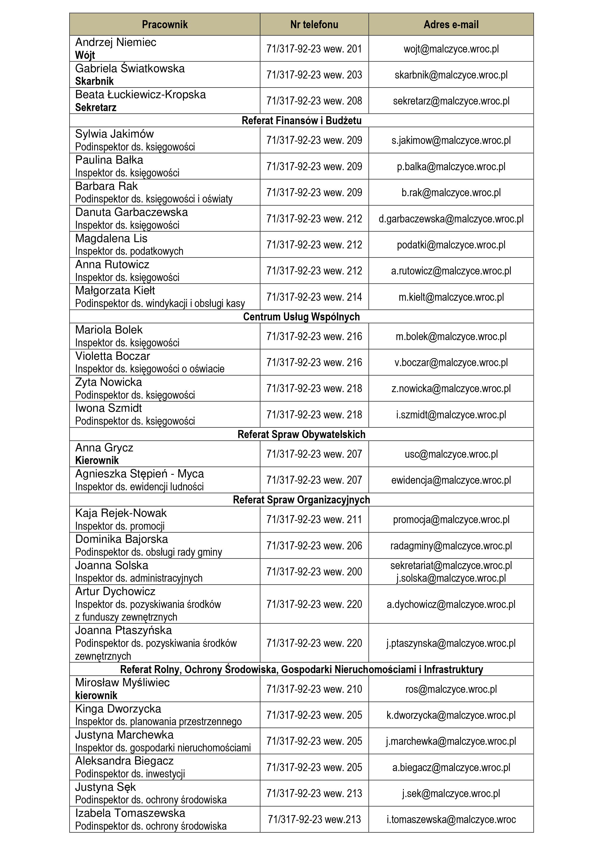 Poniżej udostępniamy wykaz pracowników wraz z numerami telefonów i mailami, prosimy o kontaktowanie się bezpośrednio z referatem lub pracownikiem odpowiedzialnym za sprawy ułatwi i usprawni to ich szybką realizację.