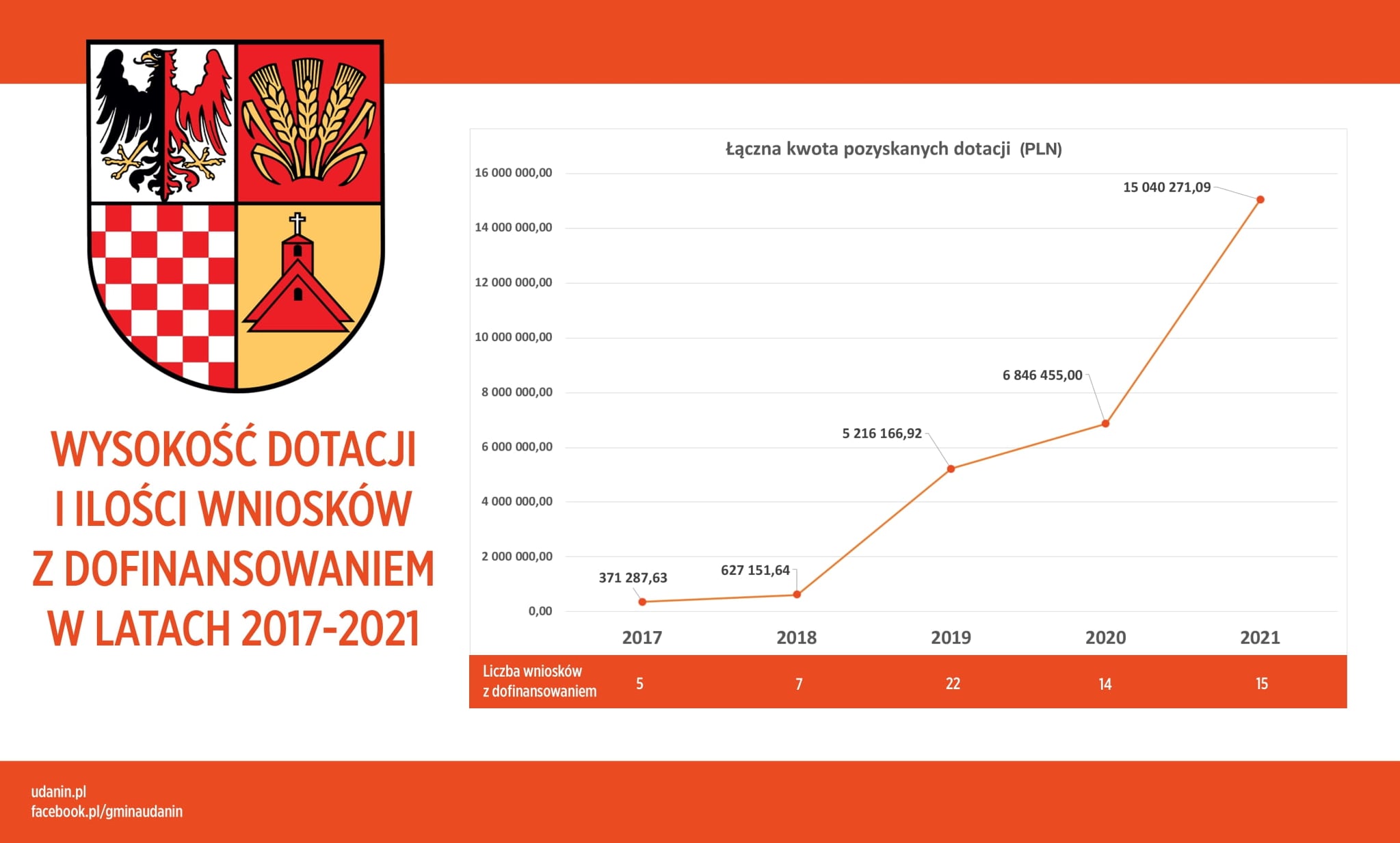 15 pozytywnie rozpatrzonych wniosków i 15 mln zł dofinansowania. To wynik Gminy Udanin w 2021 roku pod względem pozyskanych dotacji.