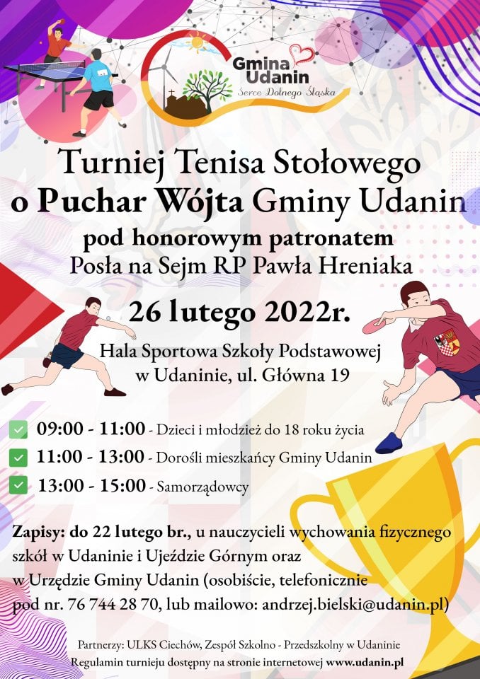 Zapraszamy do udziału w turnieju Tenisa Stołowego o Puchar Wójta Gminy Udanin Wojciech Płaziuk pod honorowym patronatem posła na sejm RP Pawła Hreniaka.