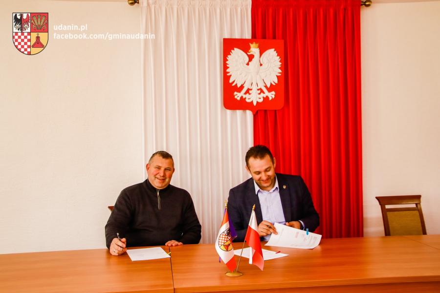 Wójt Wojciech Płaziuk oraz prezes Gminnego Związku Sportowego w Udaninie Paweł Świdziński podpisali umowę dotyczącą organizacji wydarzeń sportowych
