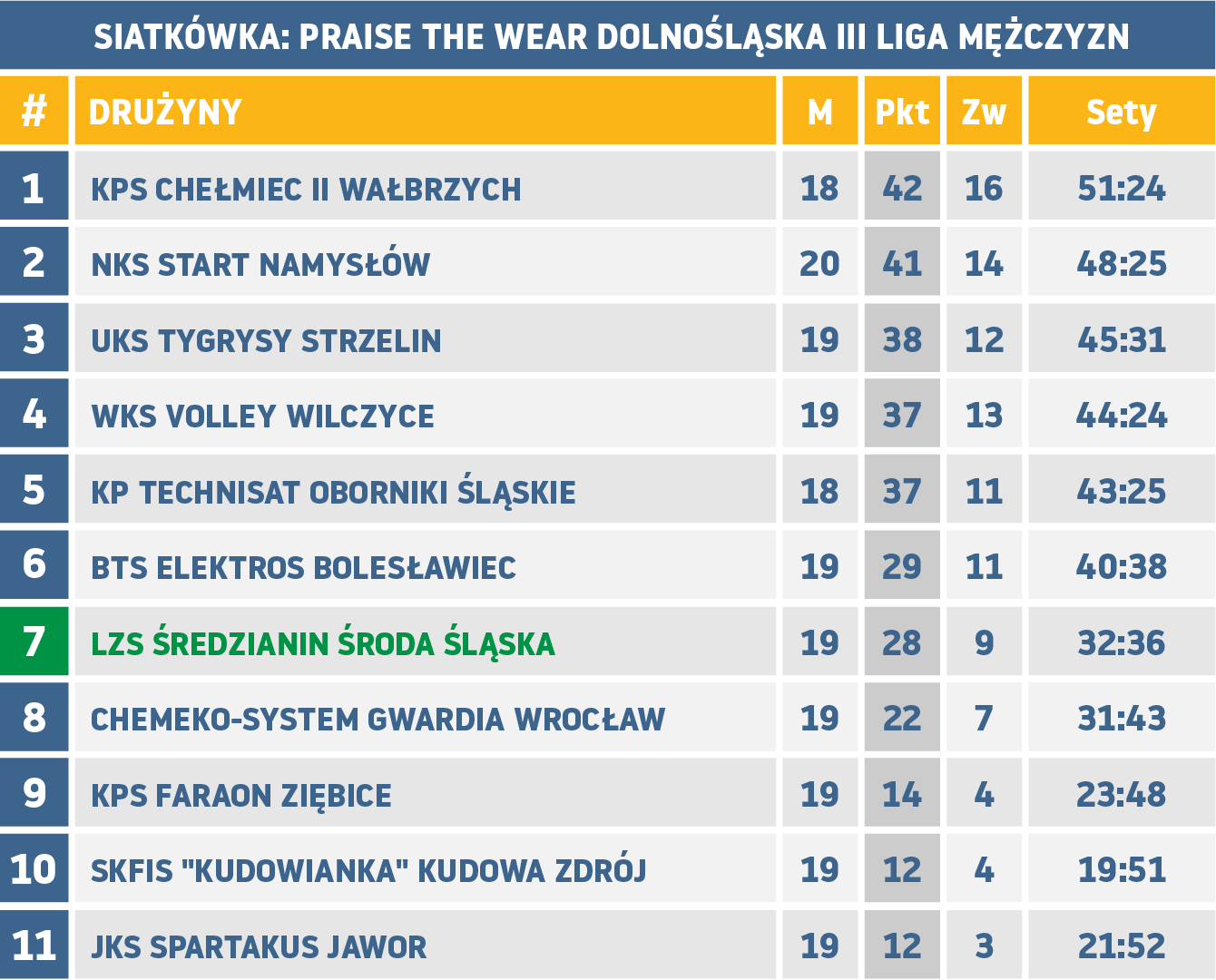 Ostatnie ligowe spotkanie Średzianin rozegra w najbliższą sobotę 12 marca o godzinie 17.00. Zespół ze Środy Śląskiej zmierzy się z niżej notowaną Kudowianką Kudowa Zdrój. – Czeka nas daleki wyjazd i gra na nietypowej hali sportowej, ale patrząc na wynik pierwszego spotkania (wygraliśmy 3:0) stawia to nas w roli faworyta. Także jedziemy po kolejne i ostatnie już w tym sezonie 3 punkty. Trzymajcie za nas kciuki – informują sportowcy.