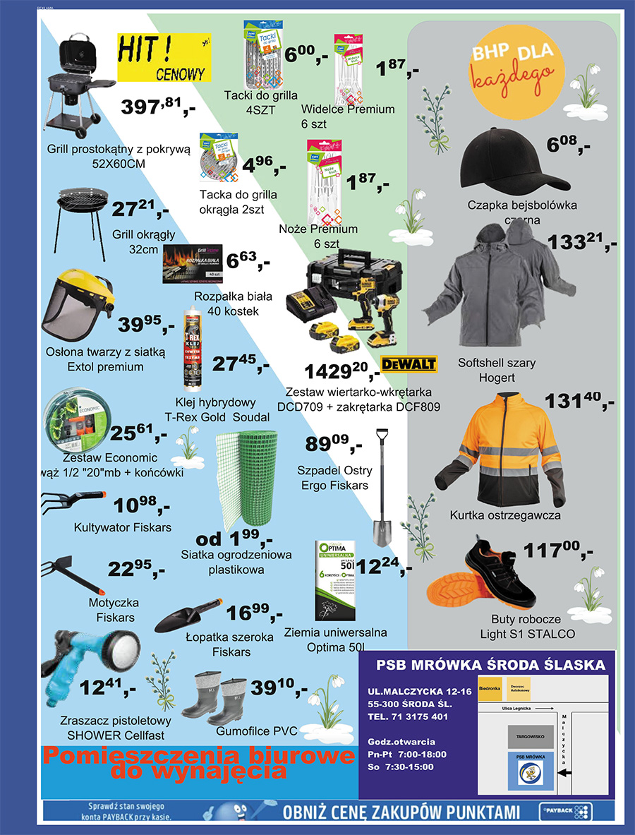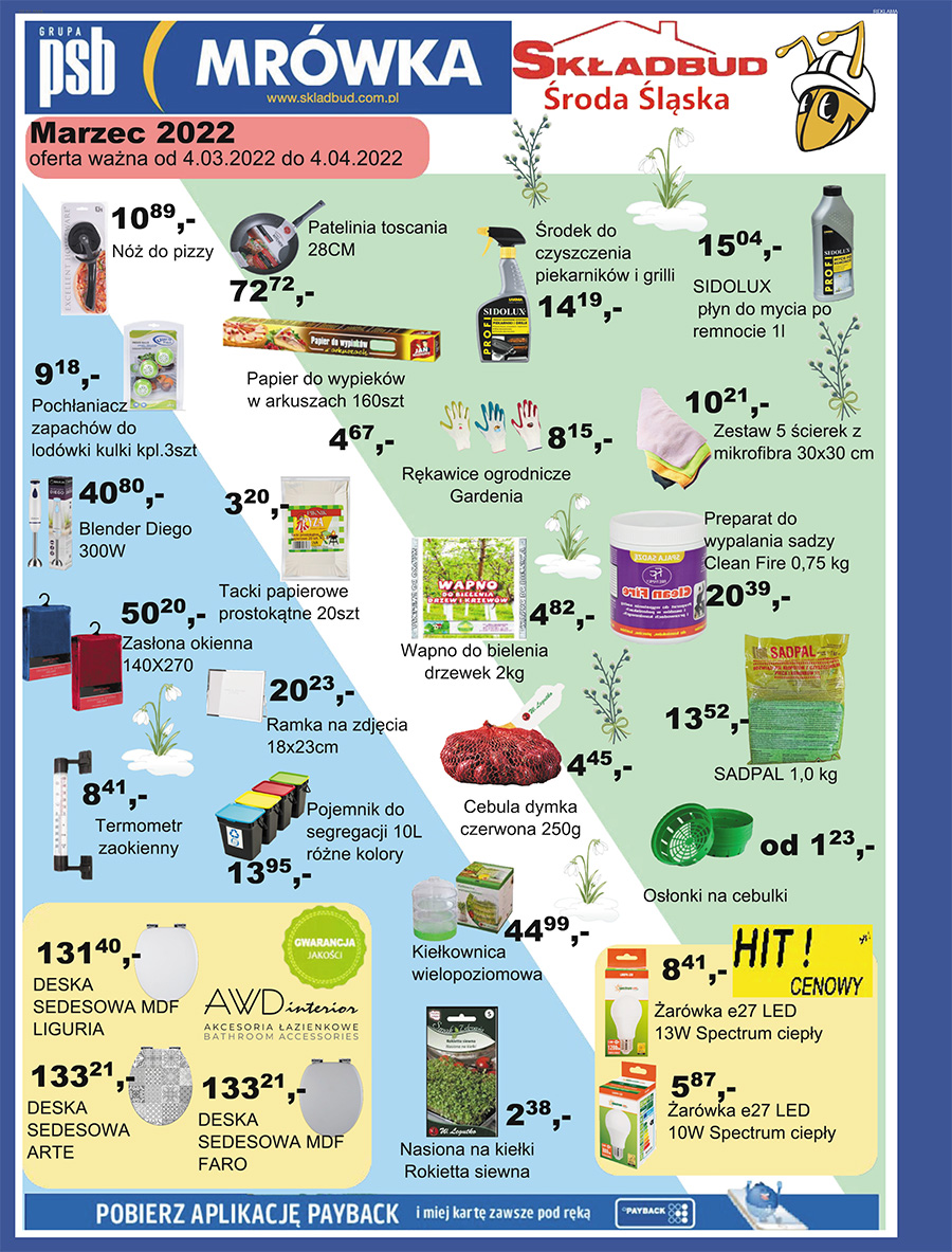 Sklep z materiałami budowlanymi PSB Mrówka Składbud, mieszczący się przy ul. Malczyckiej 12-16 w Środzie Śląskiej, prezentuje gazetkę promocyjną obowiązującą do 4 kwietnia.