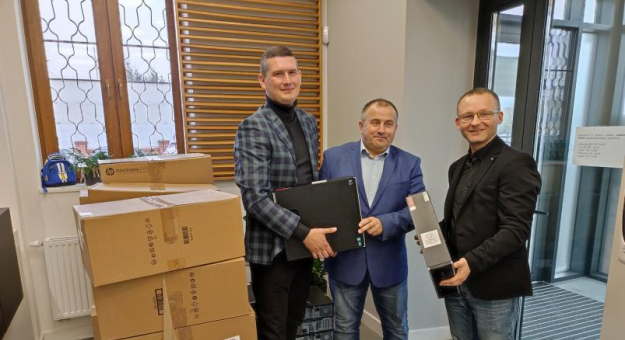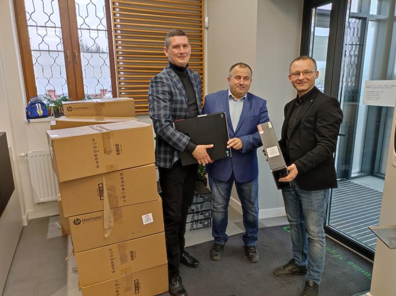 Artur Kopania i Przemysław Wałasz przywieźli do gminy Miękinia 30 komputerów stacjonarnych z ukraińską klawiaturą, które trafią do uczniów korzystających z zajęć zdalnych.