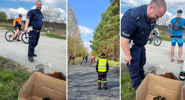 Funkcjonariusze dbali o bezpieczeństwo wszystkich uczestników ruchu drogowego, monitorując przejazd kolarzy na trasie wyścigu, kierując ruchem i organizując niezbędne objazdy. Na jednym z odcinków rozgrywanych zawodów pojawili się nieoczekiwani uczestnicy - dzikie kaczki.