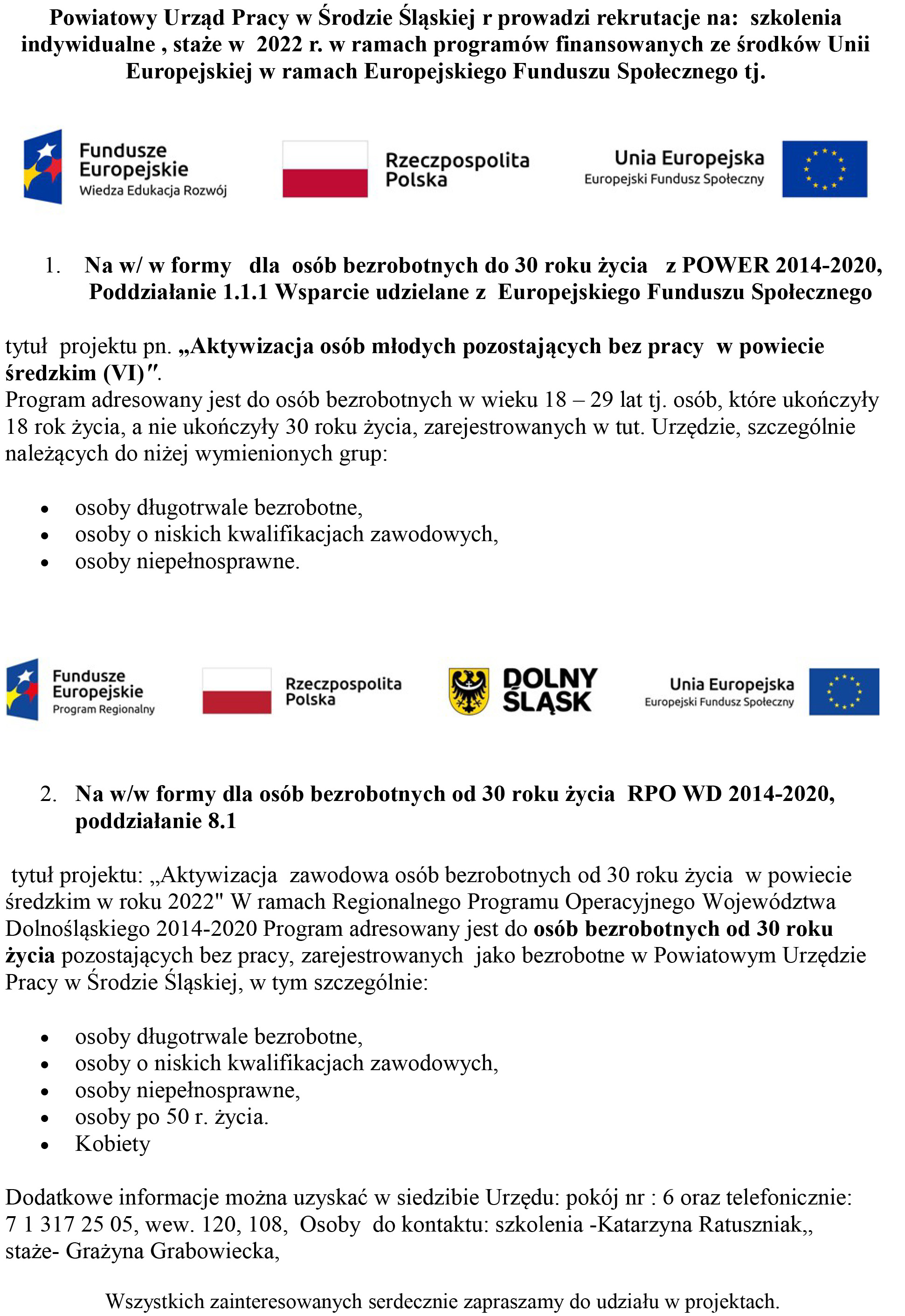 Powiatowy Urząd Pracy w Środzie Śląskiejrprowadzi rekrutacjena:szkolenia indywidualne, stażew2022r.w ramach programów finansowanych ze środków Unii Europejskiej w ramach Europejskiego Funduszu Społecznego