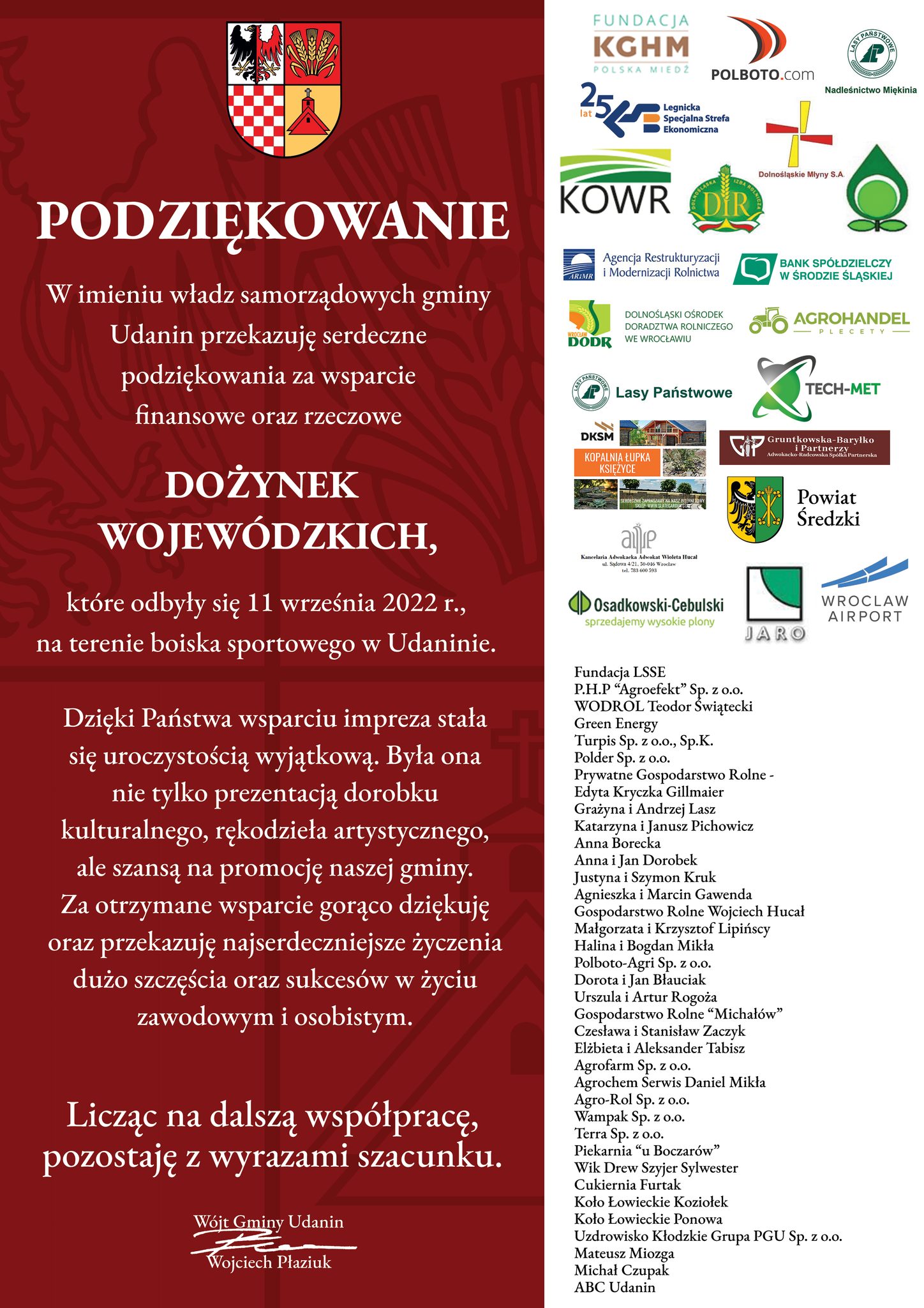 Podziękowania w imieniu władz samorządowych gminy Udanin dla osób zaangażowanych w organizację, firm i instytucji składa wójt Wojciech Płaziuk.