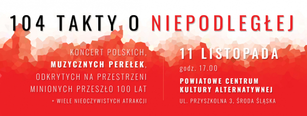 104 Takty o Niepodległej - tak nazywa się program, który Powiatowe Centrum Kultury Alternatywnej w Środzie Śląskiej przygotowało na 11 listopada. W programie koncert polskich, muzycznych perełek oraz wiele nieoczywistych atrakcji.