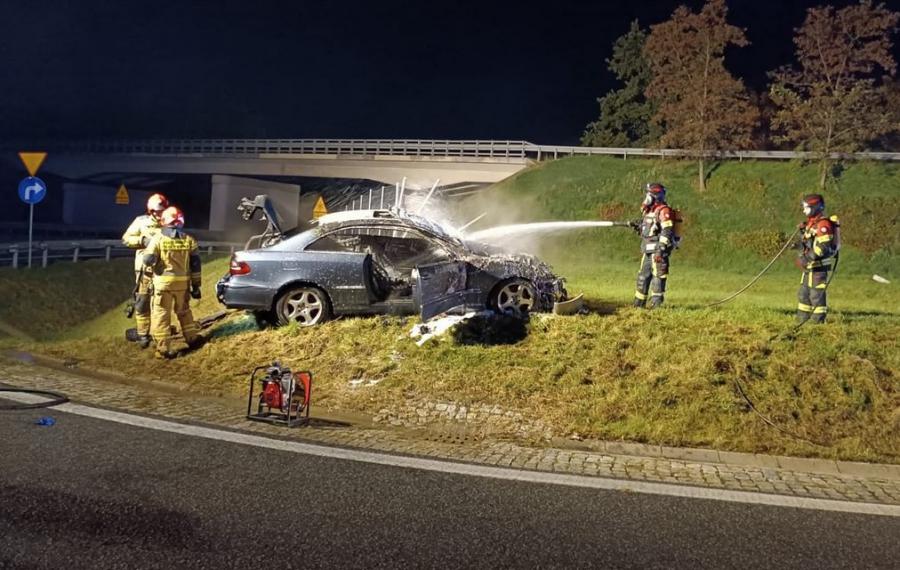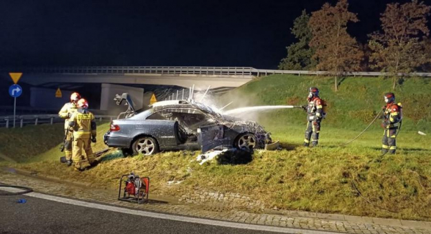 Ze wstępnych informacji wynika, że kierujący pojazdem marki Mercedes zjeżdżając na autostradę z nieustalonych przyczyn wypadł z drogi i zatrzymał się na przydrożnym ogrodzeniu. Samochód stanął w płomieniach.