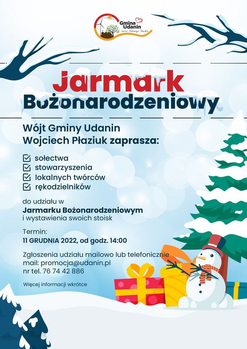 Wójt Gminy Udanin Wojciech Płaziuk zaprasza do udziału w Jarmarku Bożonarodzeniowym i wystawienia swoich stoisk:
