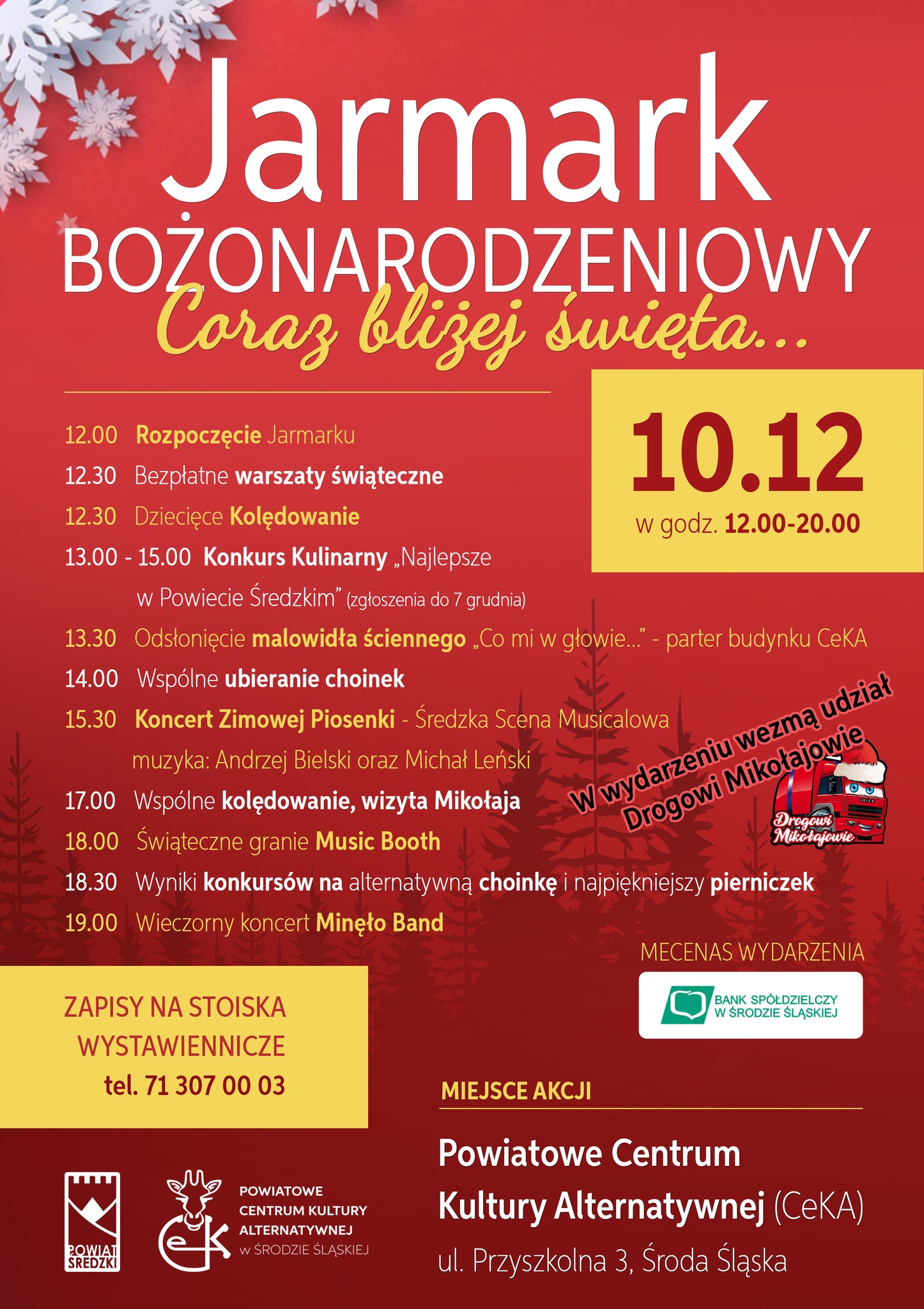 Stoiska będą ustawione zarówno na parkingu przed budynkiem, jak i na sali widowiskowej. W pracowniach zaplanowaliśmy dla Was warsztaty świąteczne (szczegóły wkrótce). Na scenie wystąpią: Średzka Scena Musicalowa, Music Booth oraz Minęło Band - oczywiście w świątecznych aranżach. Pojawi się także Mikołaj oraz jego pomocnicy. Dodatkowo odsłonimy malowidło ścienne, nad którym od dłuższego czasu dzielnie pracuje nasza zdolna młodzież (parter Centrum). Dowiemy się również kto wykonał najciekawszą, alternatywną choinkę oraz najpiękniejszy piernik (szczegóły i regulamin konkursów opublikujemy za dni kilka).