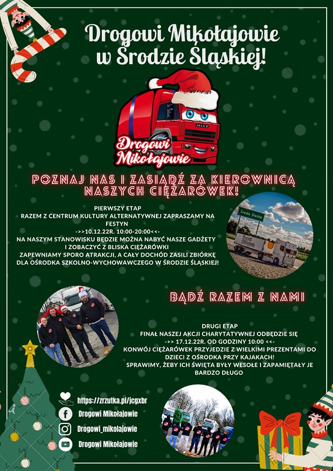 Na zewnątrz dodatkowo odbędzie się konkurs kulinarny organizowany przez Powiat Średzki. Towarzyszyć nam będą Drogowi Mikołajowie ze swoimi ciężarówkami (tak, będziecie mogli do nich wsiąść). Chłopaki zbierają fundusze na rzecz Specjalnego Ośrodka Szkolno-Wychowawczego im. J. Korczaka w Środzie Śląskiej i my im mocno w tym kibicujemy! W hali sportowej trwać będzie finał Szlachetnej Paczki!