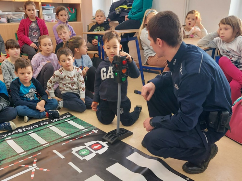 W kolejnych działaniach informacyjno-edukacyjnych wzięli udział przedszkolaki oraz uczniowie klas I-III Szkoły Podstawowej w Karczycach, którzy pod okiem Kierownik oraz dzielnicowych z Posterunku Policji w Kostomłotach, zapoznawali się z zasadami bezpiecznego przechodzenia przez jezdnię, właściwego poruszania się po drodze, w tym drodze dla rowerów. Policjanci omówili zasady obowiązujące przy przechodzeniu przez przejazdy kolejowe oraz wybrane znaki drogowe. Aby łatwiej było Naszym Skarbom zrozumieć przekazywane im informacje, policjanci korzystali z pozyskanych w ramach programu materiałów edukacyjnych takich, jak mata z przejściem dla pieszych i torami kolejowymi, znaki drogowe oraz sygnalizator świetlny.