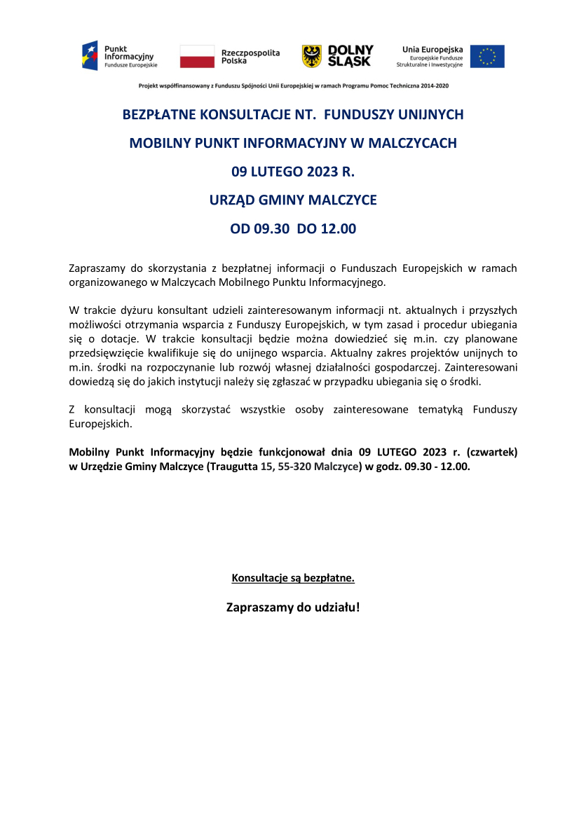 Mobilny punkt informacyjny w Malczycach? Jest to forma bezpłatnych indywidualnych konsultacji dla mieszkańców na temat możliwości pozyskania środków z UE.