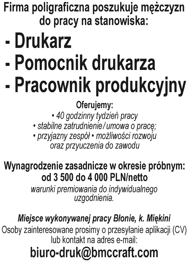 Firma poligraficzna poszukuje mężczyzn do pracy na stanowisko pomocnik produkcyjny. Miejsce pracy Błonie.