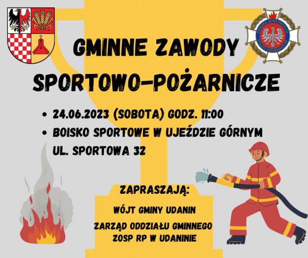 Wójt Gminy Udanin Wojciech Płaziuk i Zarząd Oddziału Gminnego ZOSP RP w Udaninie zapraszają na Gminne Zawody Sportowo-Pożarnicze w dniu 24 czerwca (sobota) o godzinie 11:00 na boisku sportowym w Ujeździe Górnym.