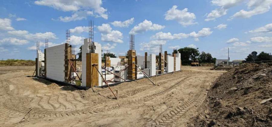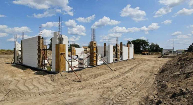 Dotychczas zaizolowano ściany fundamentowe, rozpoczęto murowanie ścian nośnych parteru, wylano beton pod posadzkę, rozpoczęto również korytowanie pod budowę boiska.