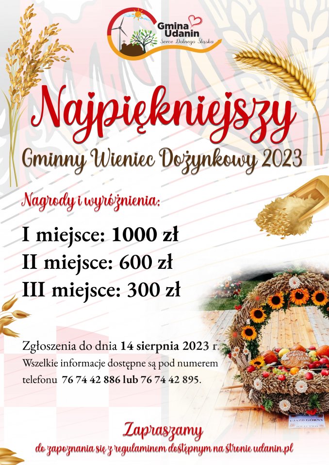 Zapraszamy sołectwa, stowarzyszenia, koła gospodyń wiejskich, instytucje gminne oraz indywidualnych wytwórców z terenu gminy Udanin do udziału w konkursie na najpiękniejszy gminny wieniec dożynkowy.