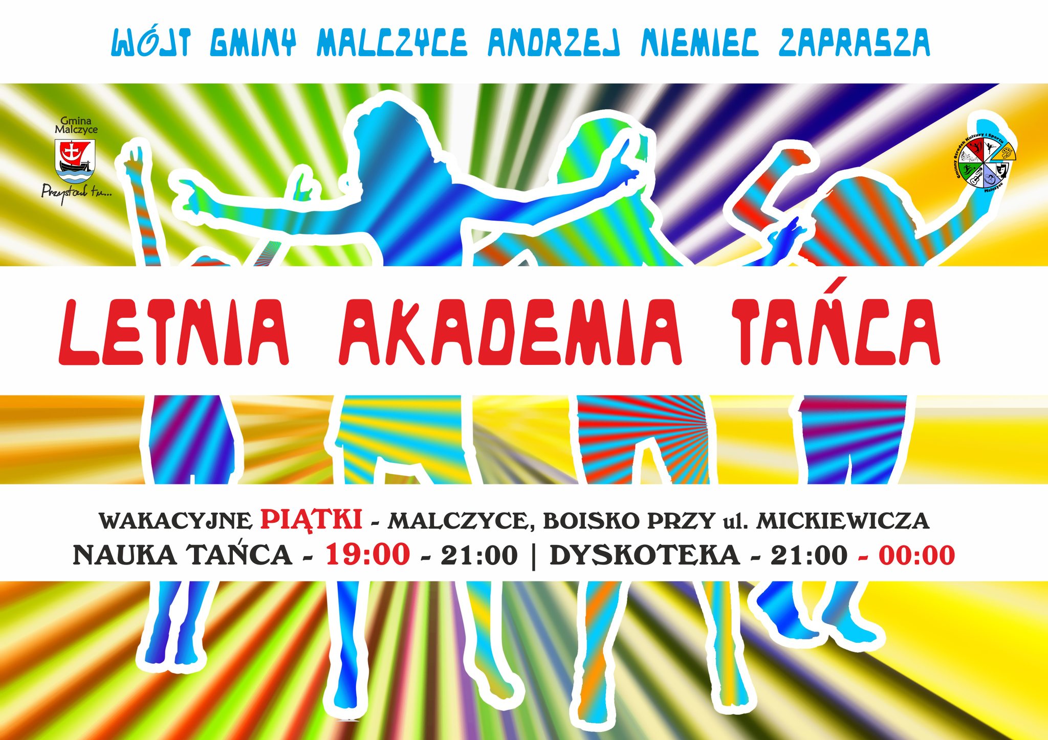 W każdy wakacyjny piątek począwszy od 21 lipca na stadionie przy ul. Mickiewicza w Malczycach o godz. 19:00 rozpocznie się nauka tańca towarzyskiego pod okiem profesjonalnych instruktorów! A do późnych godzin wieczornych dyskoteka pod chmurką z DJ Wojtkiem. Wstęp wolny! Rezerwujcie swój czas!