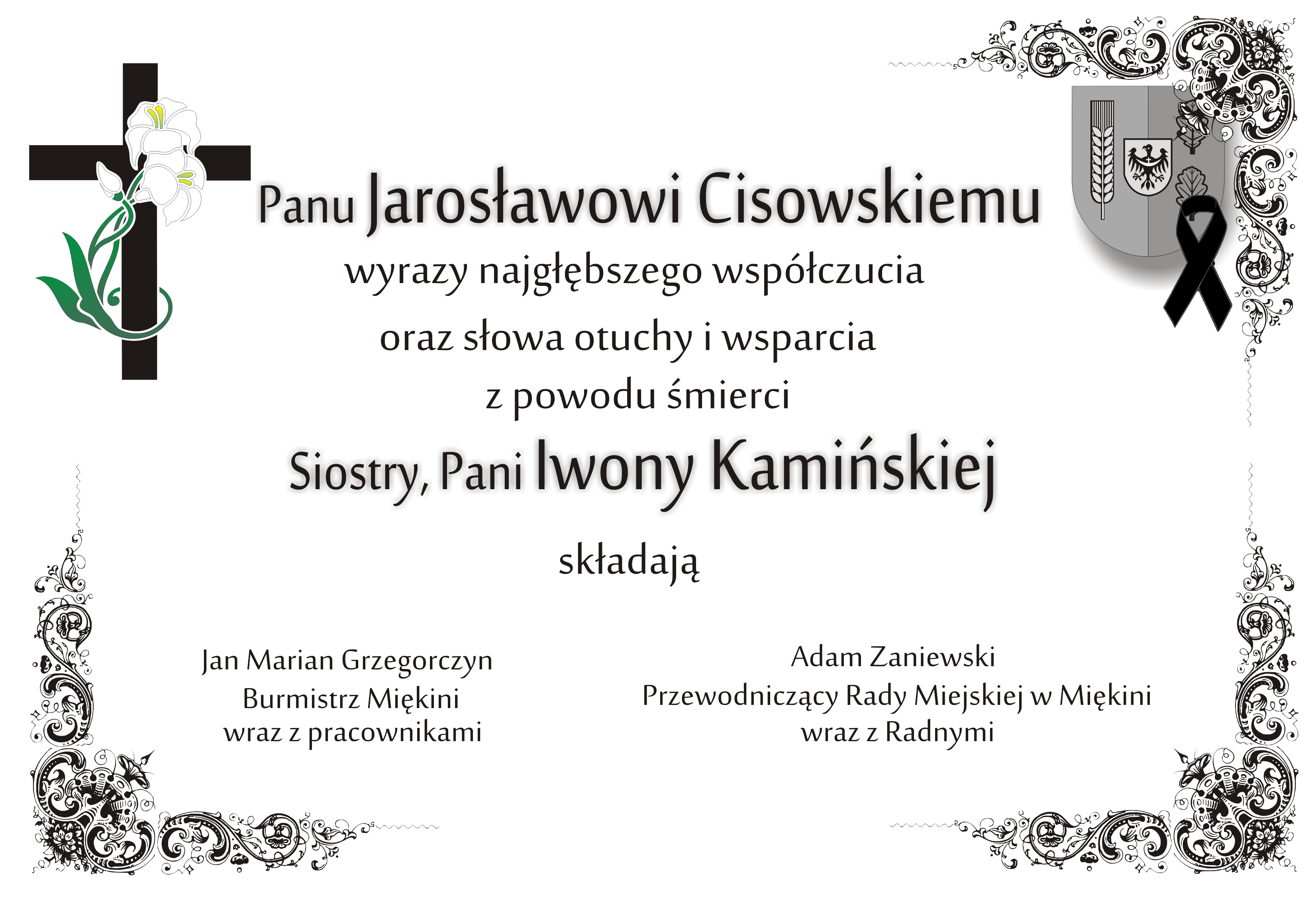 Burmistrz Miękini Jan Marian Grzegorczyn oraz Przewodniczący Rady Miejskiej w Miękini Adam Zaniewski wraz z Radnymi składają najszczersze kondolencje Panu Jarosławowi Cisowskiemu.