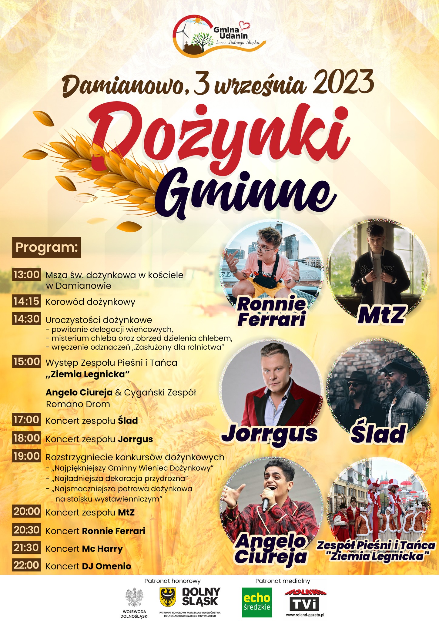 Wójt Gminy Udanin Wojciech Płaziuk, Sołtys Damianowa Kamil Młynarczyk oraz Rada Sołecka Sołectwa Damianowo zapraszają rolników, mieszkańców gminy oraz okolicznych miejscowości na największe wydarzenie Gminy Udanin - Dożynki Gminne 2023, które swoim Patronatem Honorowym objęli Wojewoda Dolnośląski Jarosław Obremski oraz Marszałek Województwa Dolnośląskiego Cezary Przybylski!