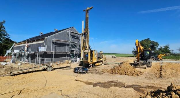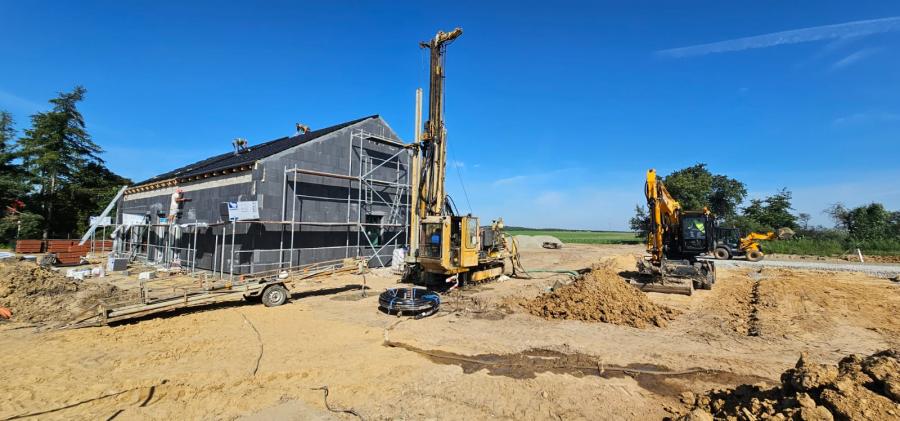 W ostatnich dniach zamontowano stolarkę okienną, trwają prace związane z wykonaniem elewacji budynku i pokrycia dachowego. W ramach zagospodarowania terenu prowadzone są prace ziemne związane z wykonaniem podbudowy pod nawierzchnię boiska. Rozpoczęto również odwierty pod źródło ciepła - pompy gruntowe.