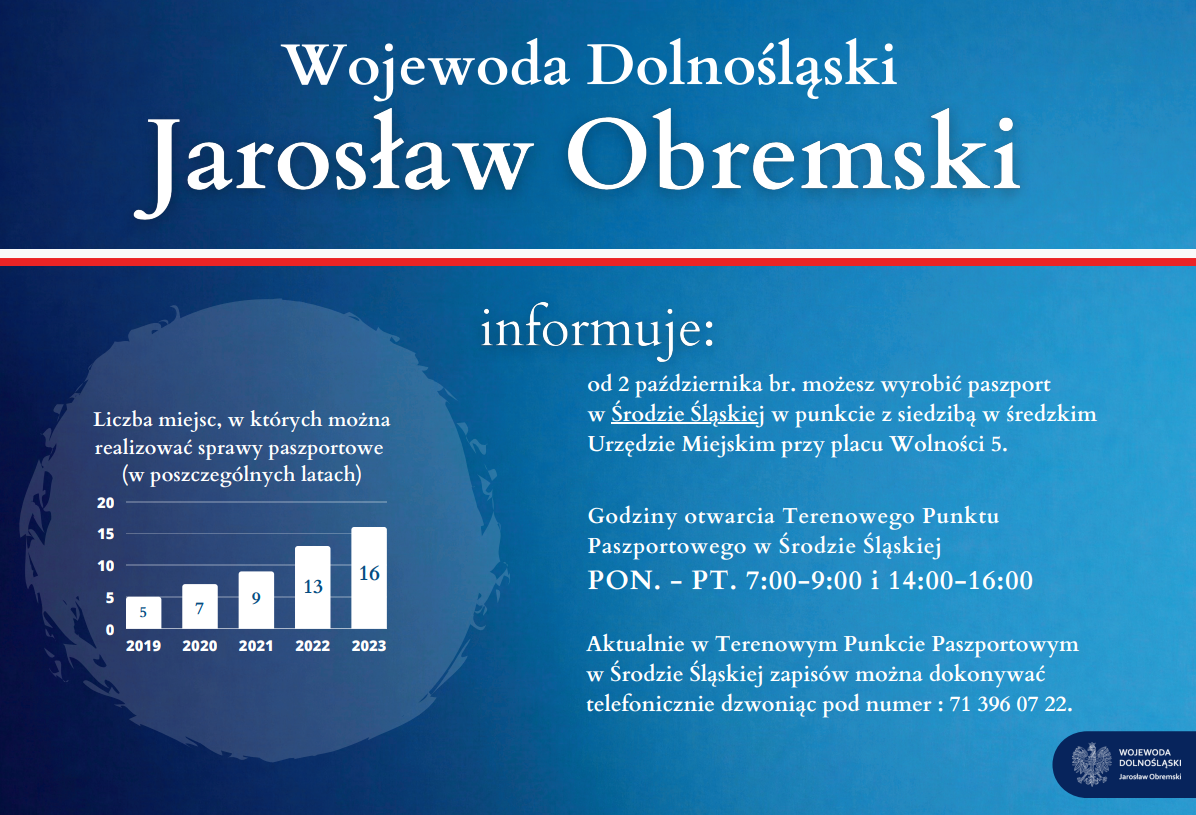 Wojewoda Jarosław Obremski informuje, że od 2 października możesz wyrobić paszport w Środzie Śląskiej w punkcie z siedzibą w średzkim Urzędzie Miejskim przy Placu Wolności 5.