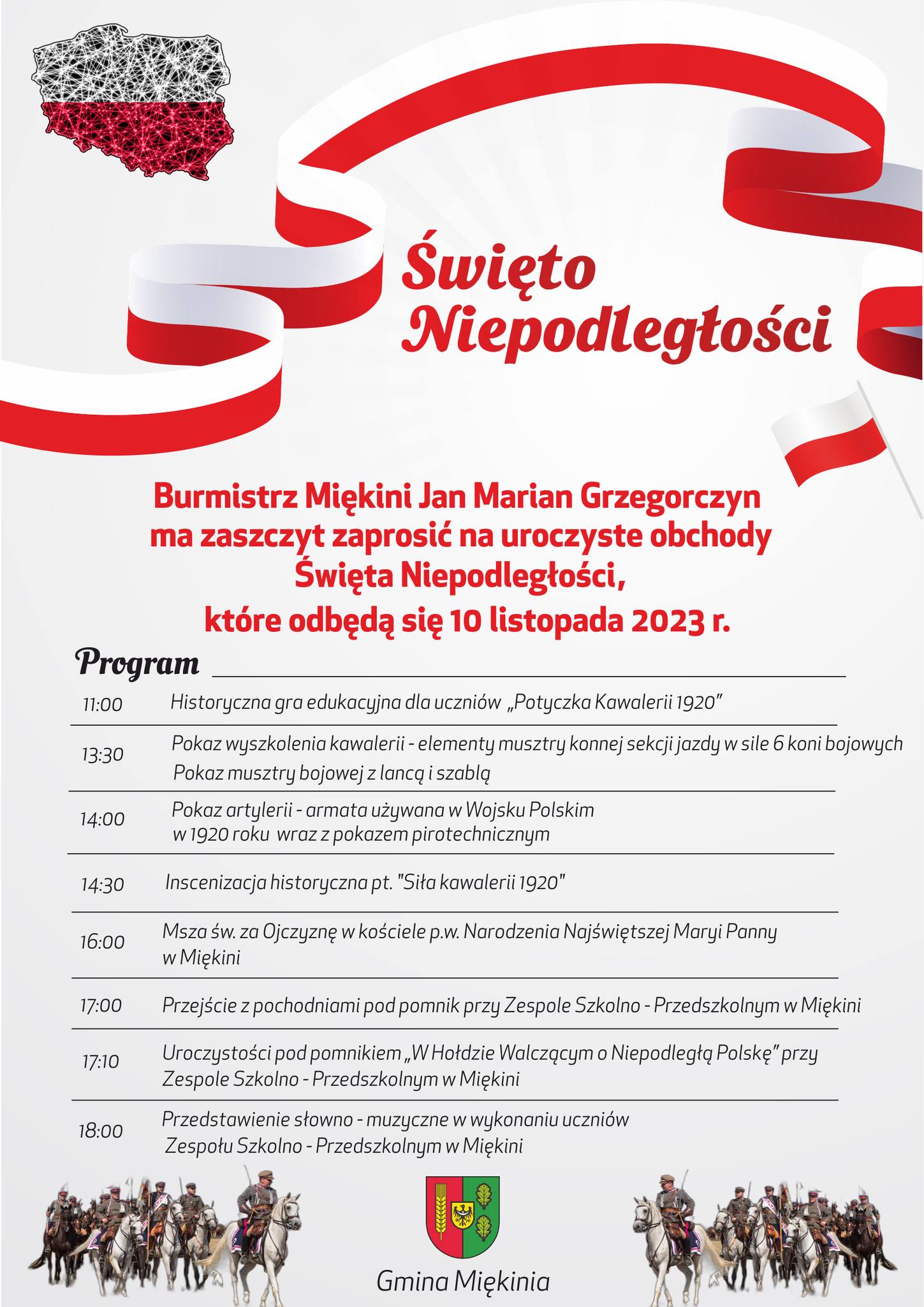 Zapraszamy Państwa również do wzięcia udziału we Mszy św. za Ojczyznę, która odbędzie się w kościele p.w. Narodzenia Najświętszej Maryi Panny w Miękini o godz. 16:00. Następnie przejdziemy z pochodniami pod pomnik „W Hołdzie Walczącym o Niepodległą Polskę” przy Zespole Szkolno-Przedszkolnym w Miękini, gdzie odbędą się dalsze uroczystości w których weźmie udział m.in. kompania reprezentacyjna 10 Brygady Łączności. Na zakończenie zapraszamy na przedstawienie patriotyczne w hali sportowej Zespołu Szkolno-Przedszkolnego w Miękini.