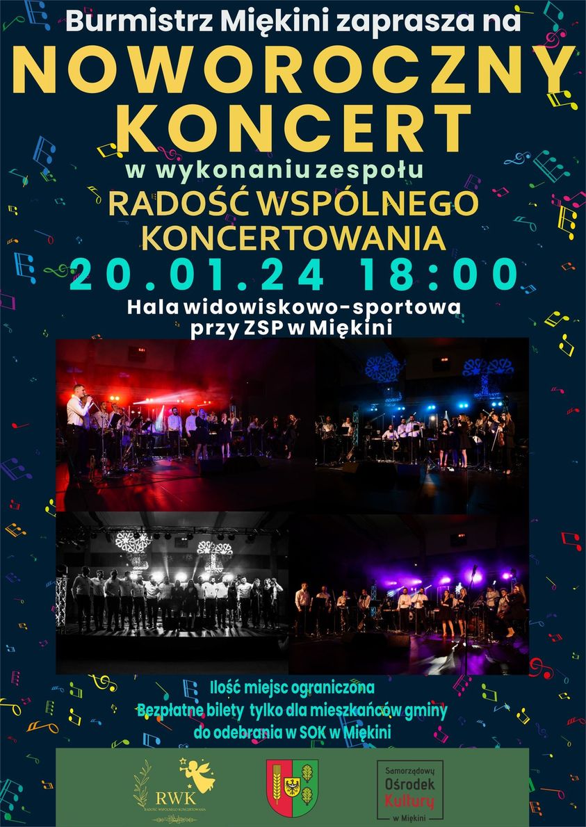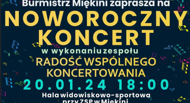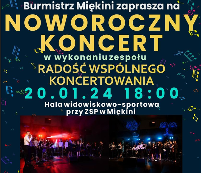 Zapraszamy na Noworoczny Koncert w wykonaniu zespołu Radość Wspólnego Koncertowania z Nowego Sącza, który odbędzie się 20 stycznia 2024r. o godz. 18:00 w hali widowiskowo-sportowej przy ZSP w Miękini.